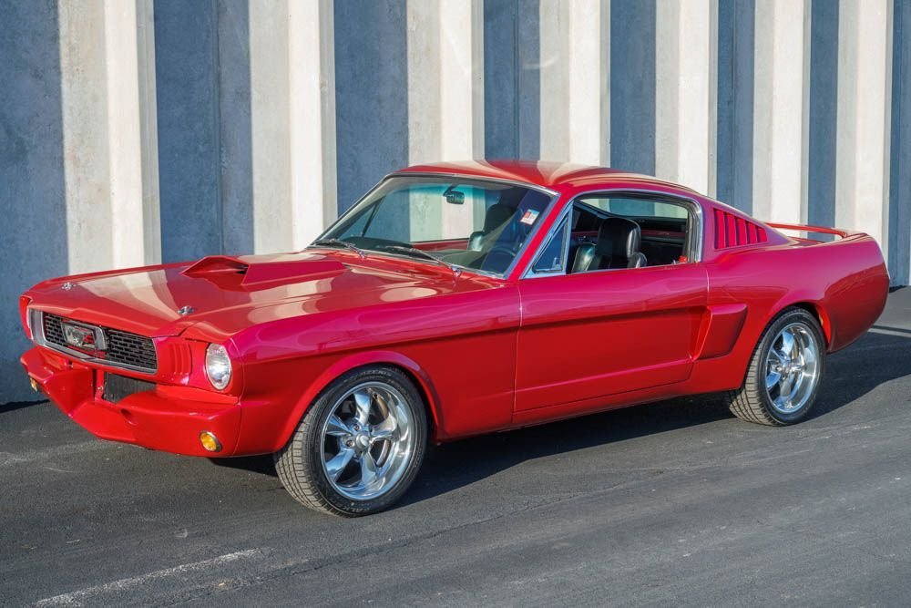 1965 Ford Mustang Fastback Restomod (Sunrise Red Pearl) Summary Unique one-off custom Mustang Fastback finished in Sunrise Red Pearl with Blue Pearl Ghost Flames. Features Shelby-style nose, widened rear, functional scoops, and four-wheel disc brakes. Solid body and frame with minor imperfections; wiring and suspension refreshed in 2019. Engine & Driveline 331 CID V8 (bored and stroked) with Barry Grant four-barrel carburetor Electronic ignition, M/T valve covers, dual exhaust system Ford C4 3-speed automatic transmission 9-inch Ford rear differential with 3.73 gears Polished strut tower brace Chassis & Suspension Falken Azenis FK450 tires – 235/45ZR17 (front), 255/40ZR17 (rear) Five-spoke Boyd Coddington alloy wheels Four-wheel disc brakes Overhauled suspension; includes extra Scott Drake mirrors and handles Interior Black vinyl upholstery with matching panels and carpet Grant GT steering wheel, Sunpro gauges (oil, temp, volts) Sunpro tachometer on column, floor shifter, aftermarket audio (Kenwood stereo inop) Power windows, cupholders Horn inoperative Condition Solid and well-kept restomod with tasteful custom touches Minor cosmetic imperfections; very good mechanical order Odometer 4,450 mi